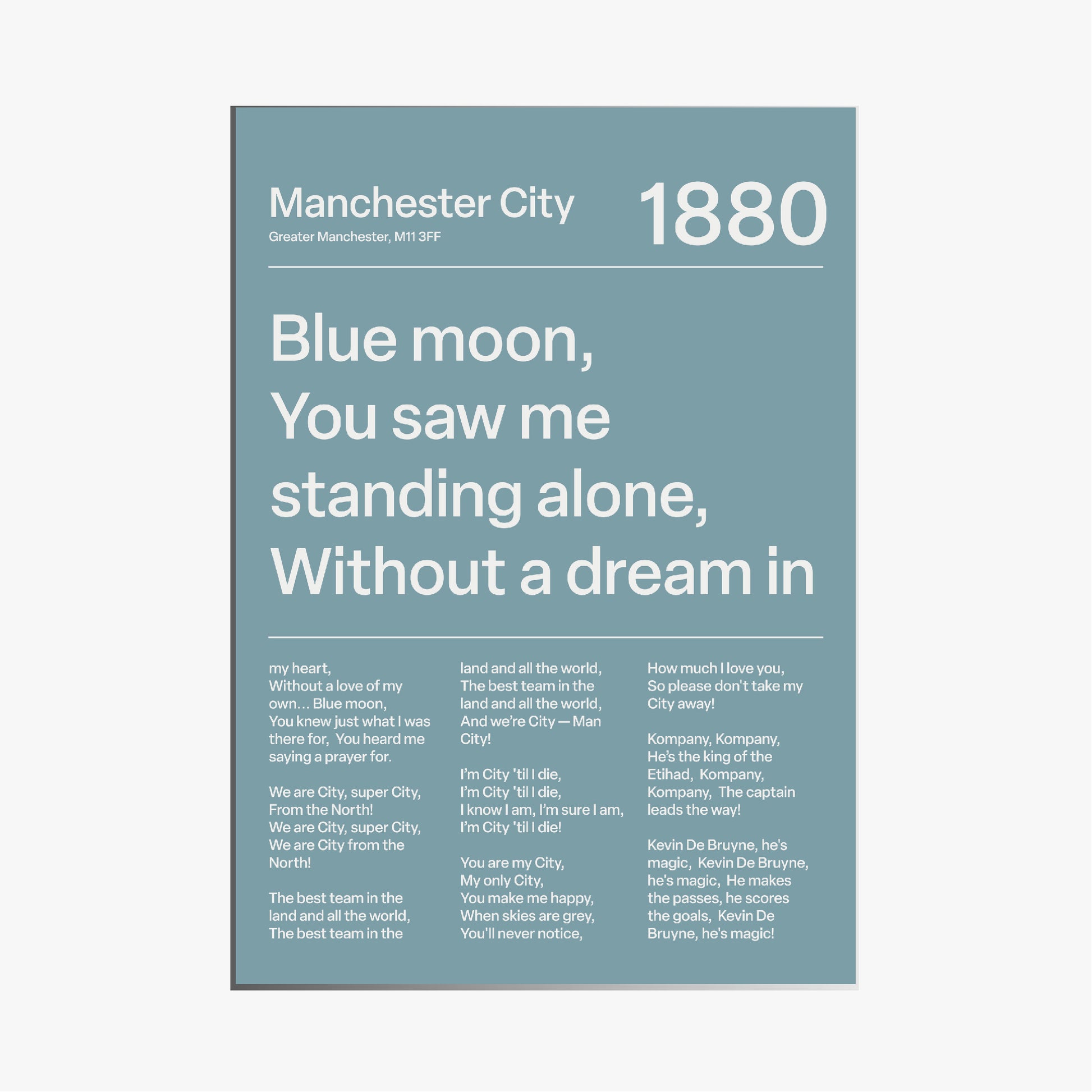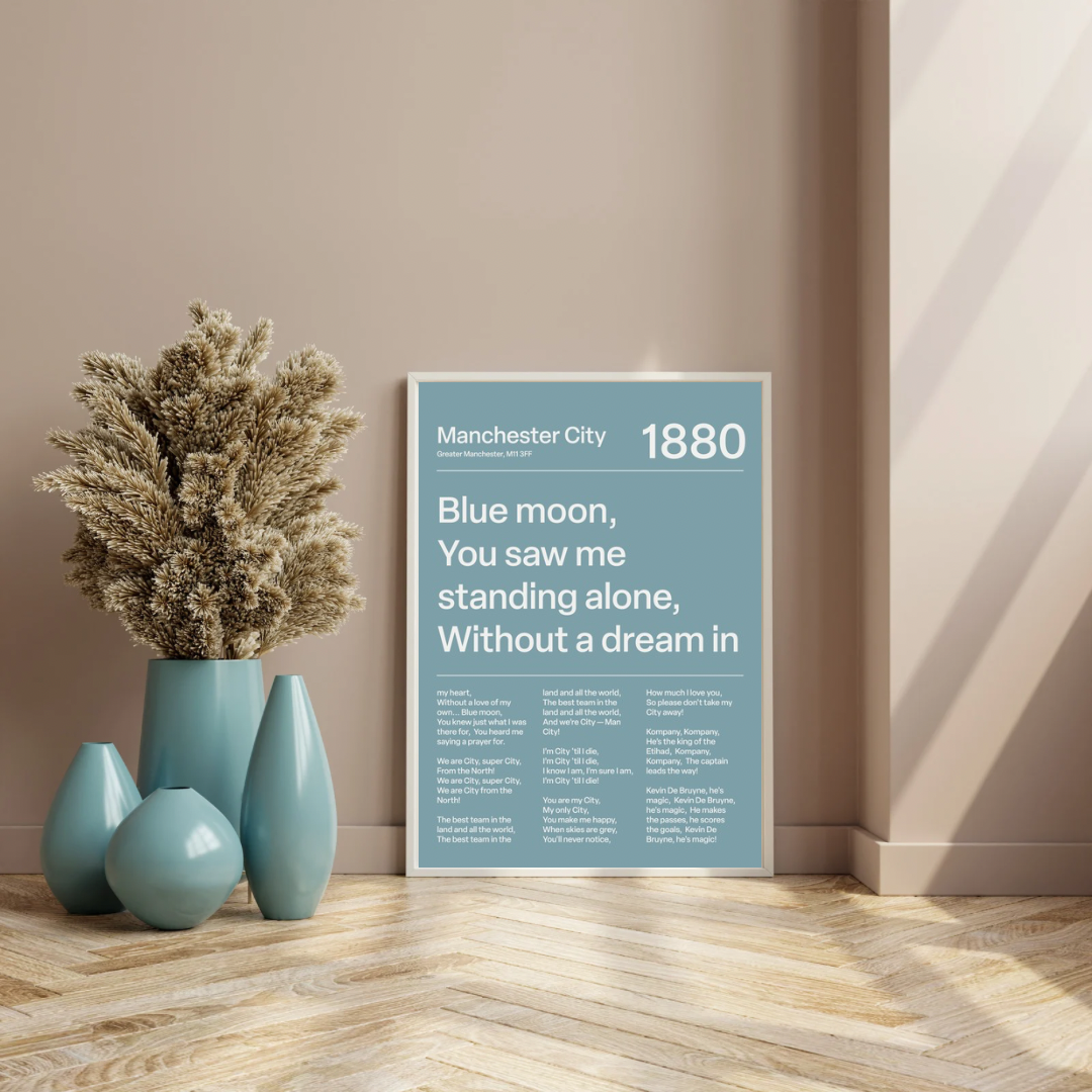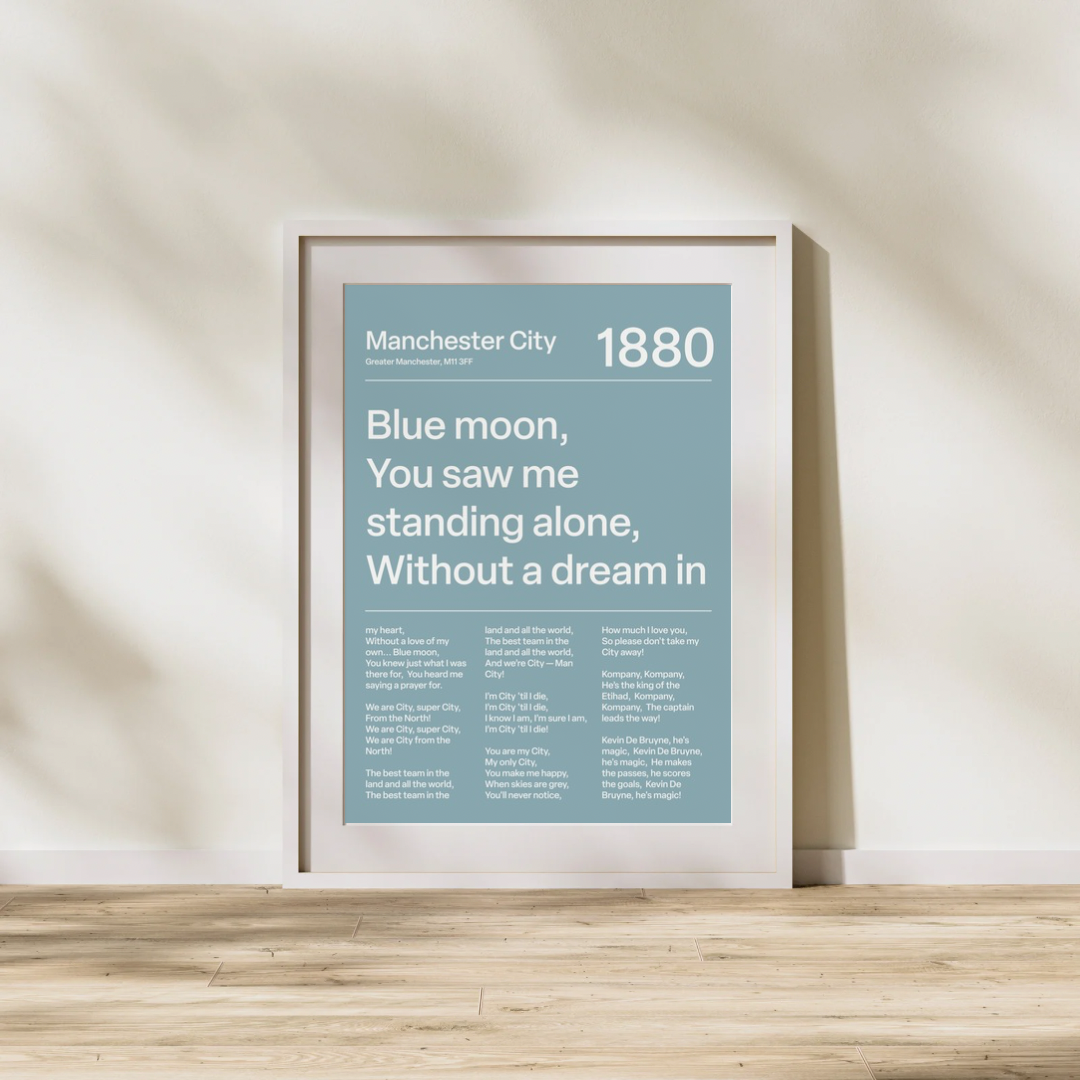 Sounds of the stands, meets modern design. This print brings the most iconic Manchester City fan chants to life. A sharp, understated piece for any Blues collection. This is our light blue variant.