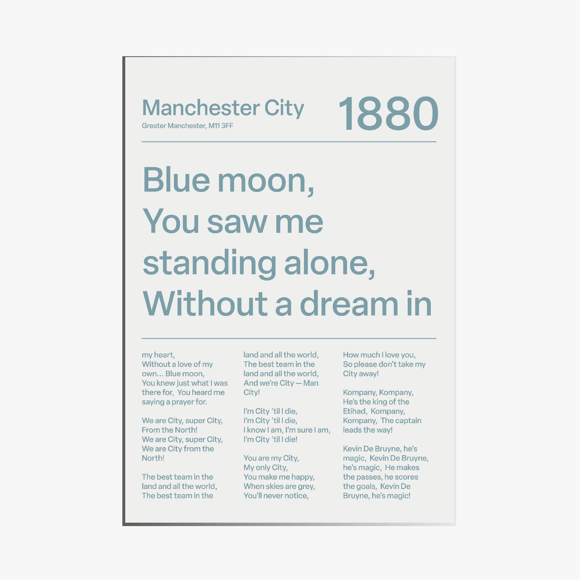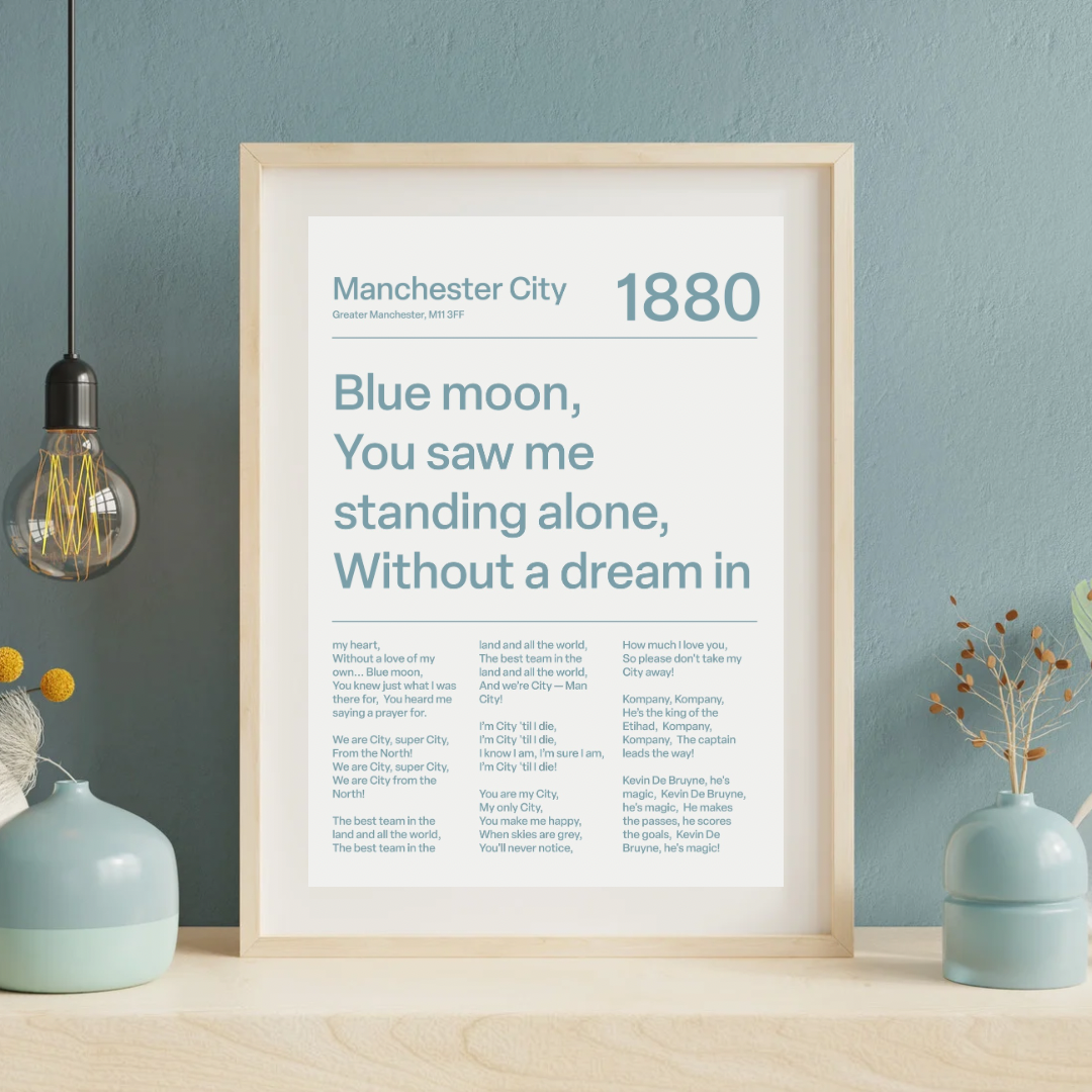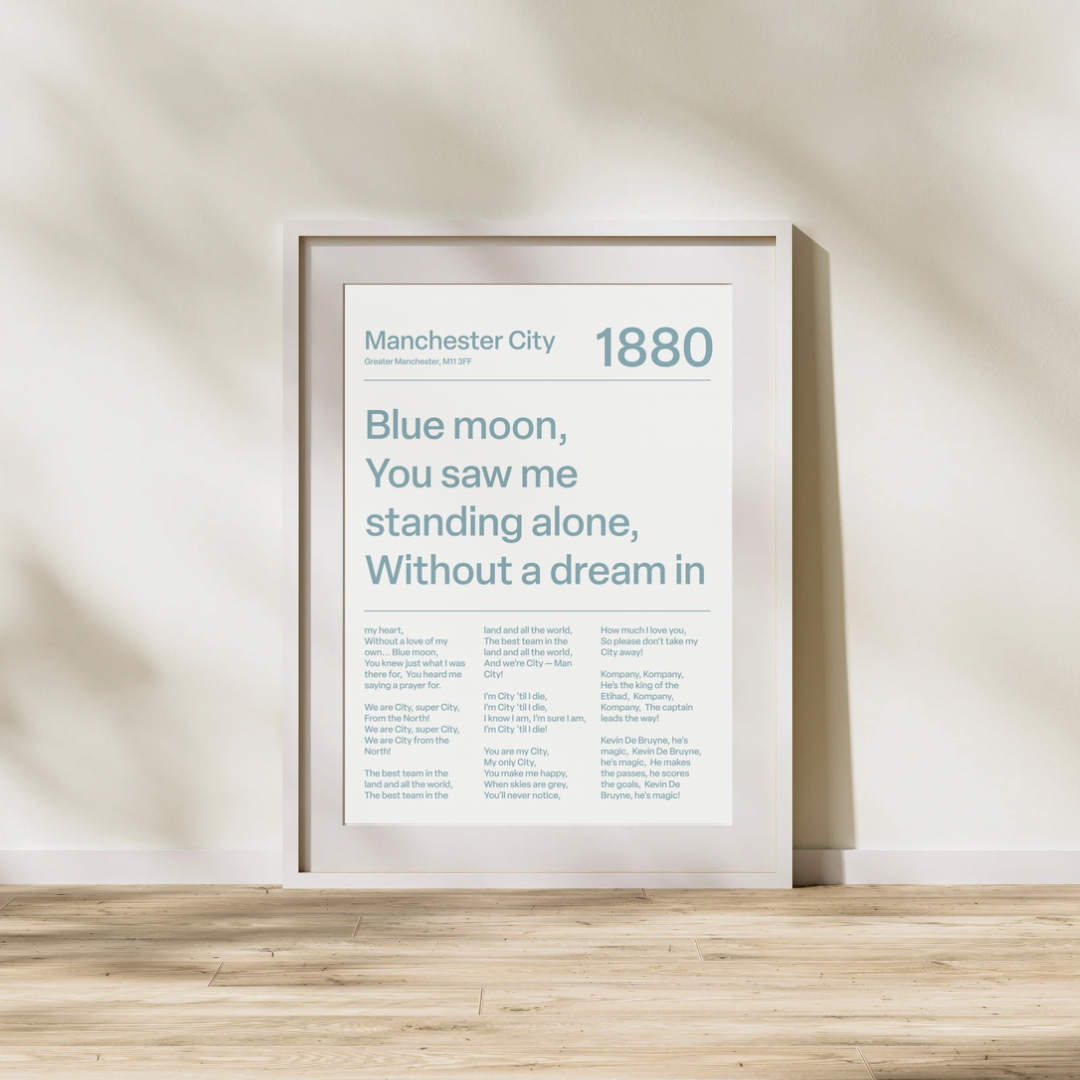 Sounds of the stands, meets modern design. This print brings the most iconic Manchester City fan chants to life. A sharp, understated piece for any Blues collection. This is our white variant.