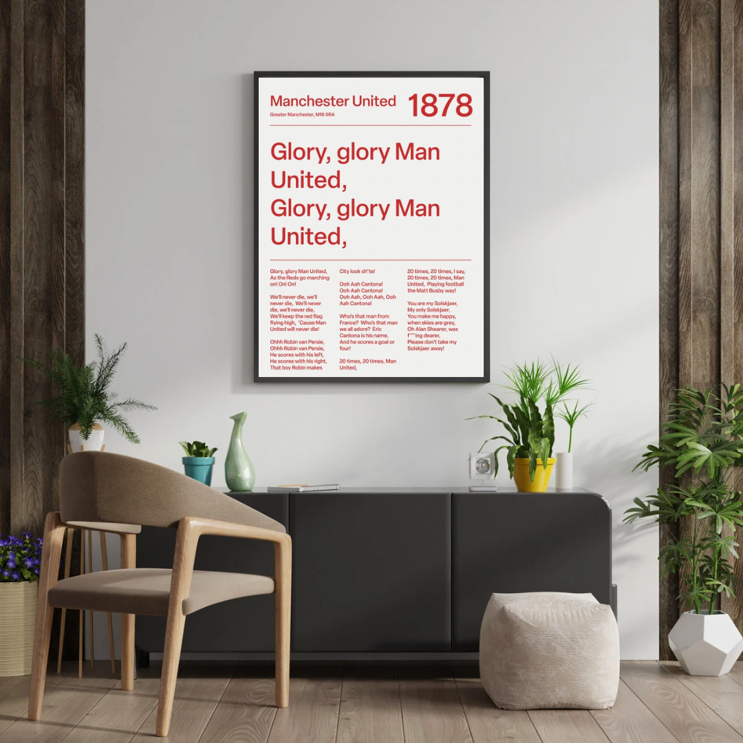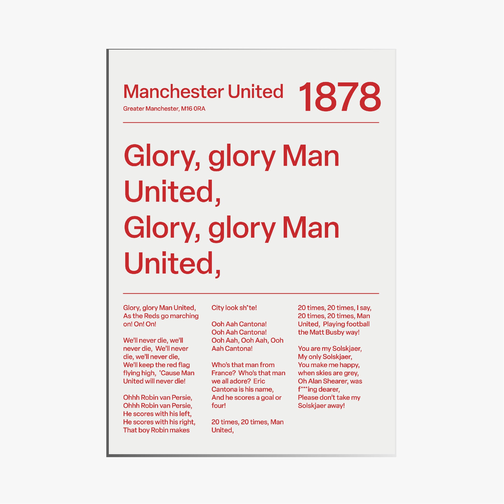 Sounds of the stands, meets modern design. This print brings the most iconic Manchester United fan chants to life. A sharp, understated piece for any Devil´s collection. This is our white variant.