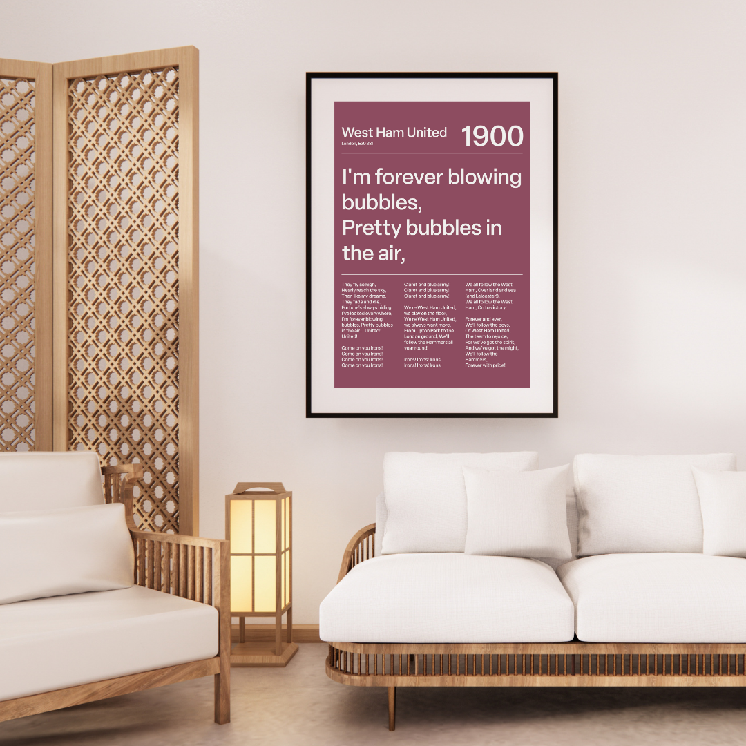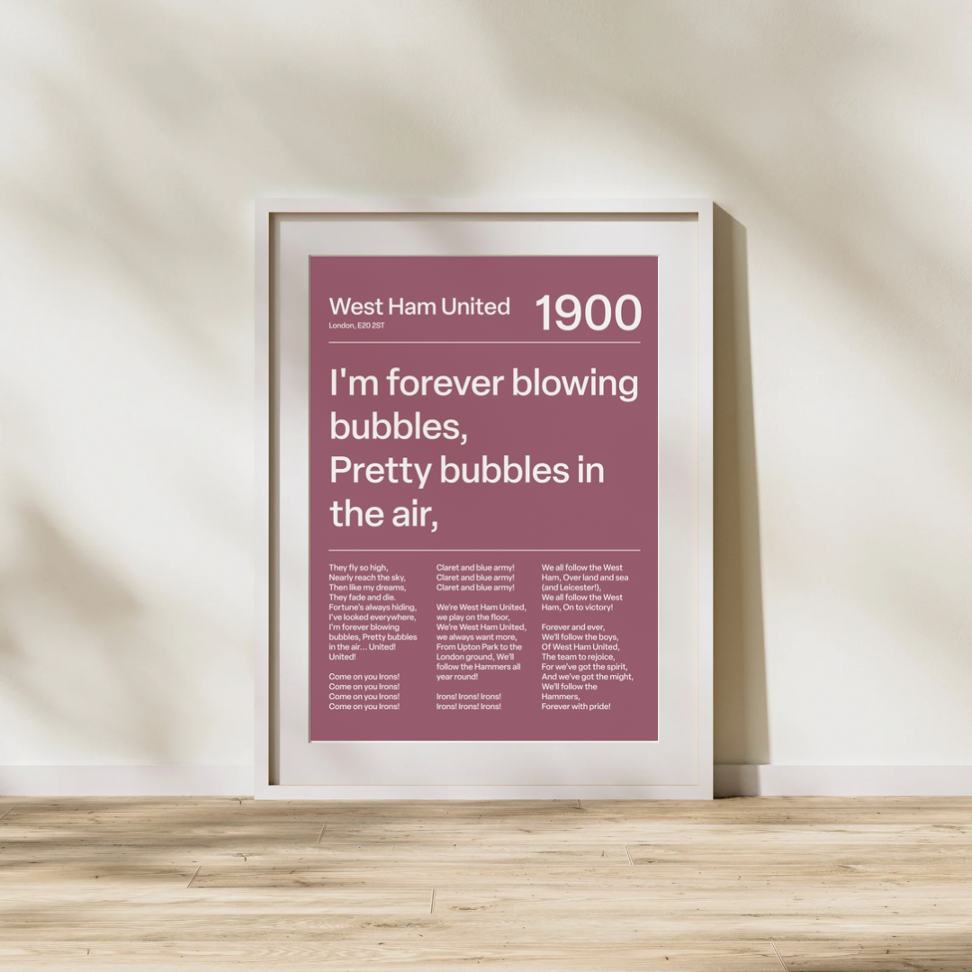 Sounds of the stands, meets modern design. This print brings the most iconic West Ham fan chants to life. A sharp, understated piece for any Hammer´s collection. This is our maroon variant.
