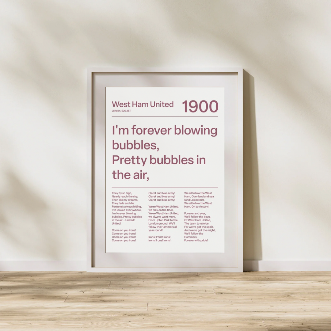 Sounds of the stands, meets modern design. This print brings the most iconic West Ham fan chants to life. A sharp, understated piece for any Hammer´s collection. This is our white variant.