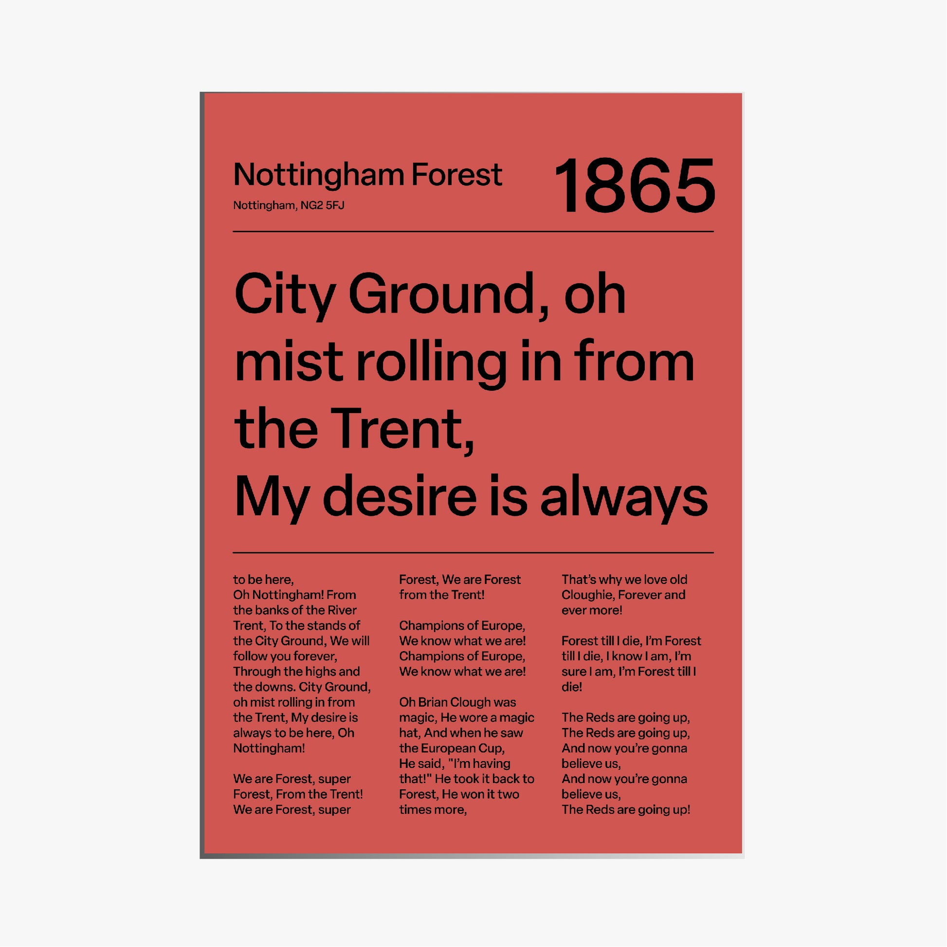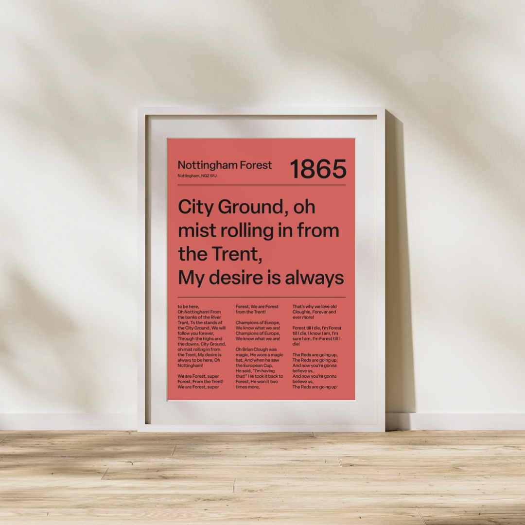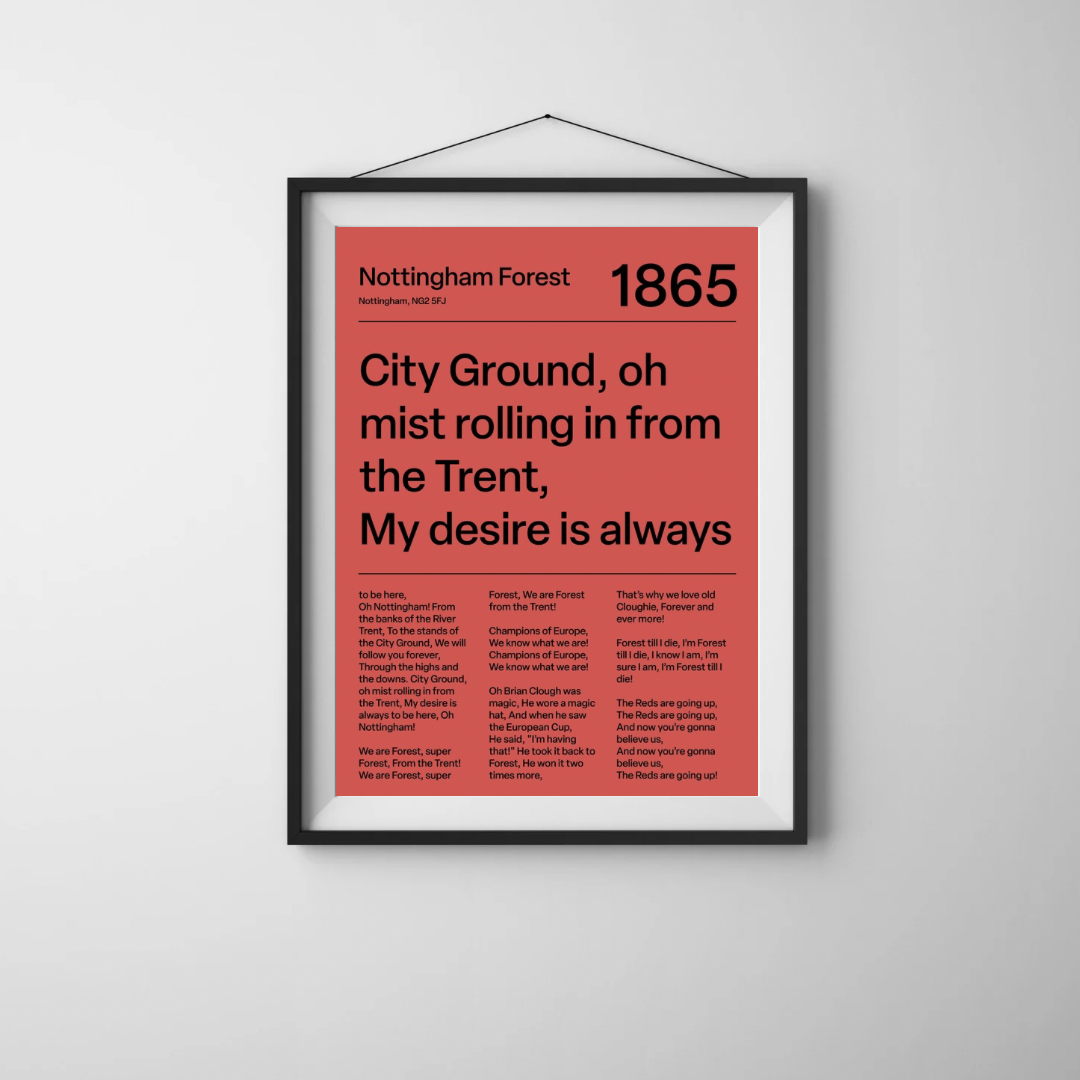 Sounds of the stands, meets modern design. This print brings the most iconic Nottingham Forest fan chants to life. A sharp, understated piece for any Red´s collection. This is our red variant.