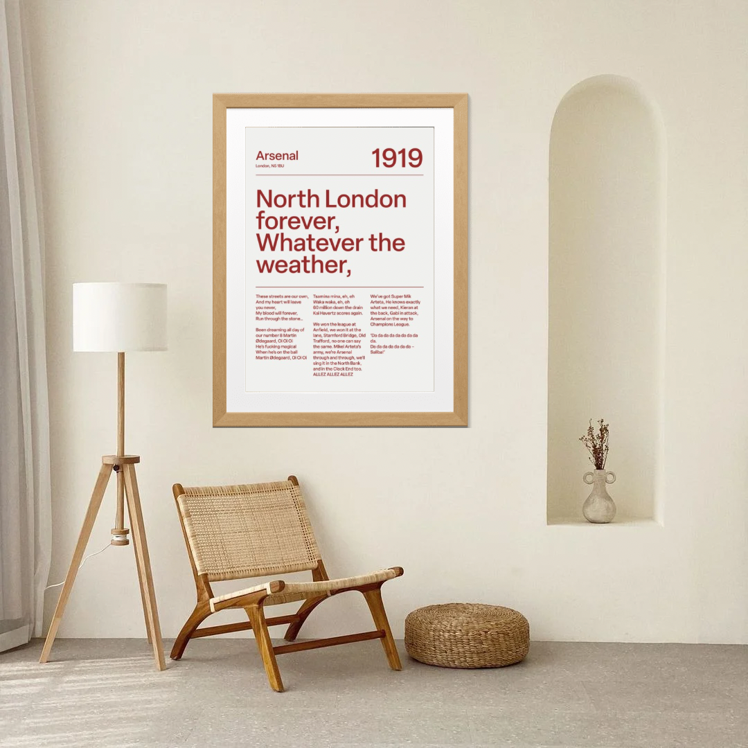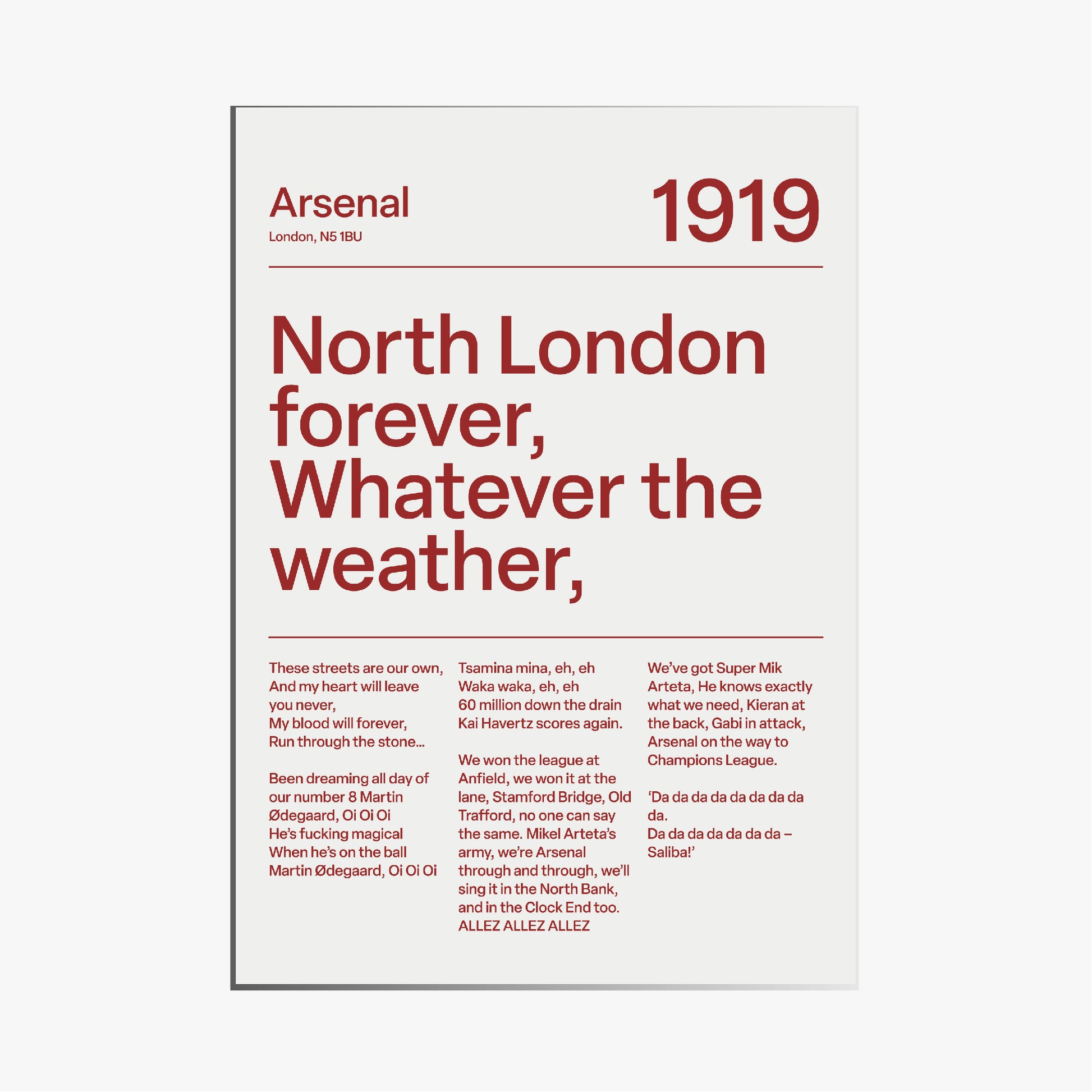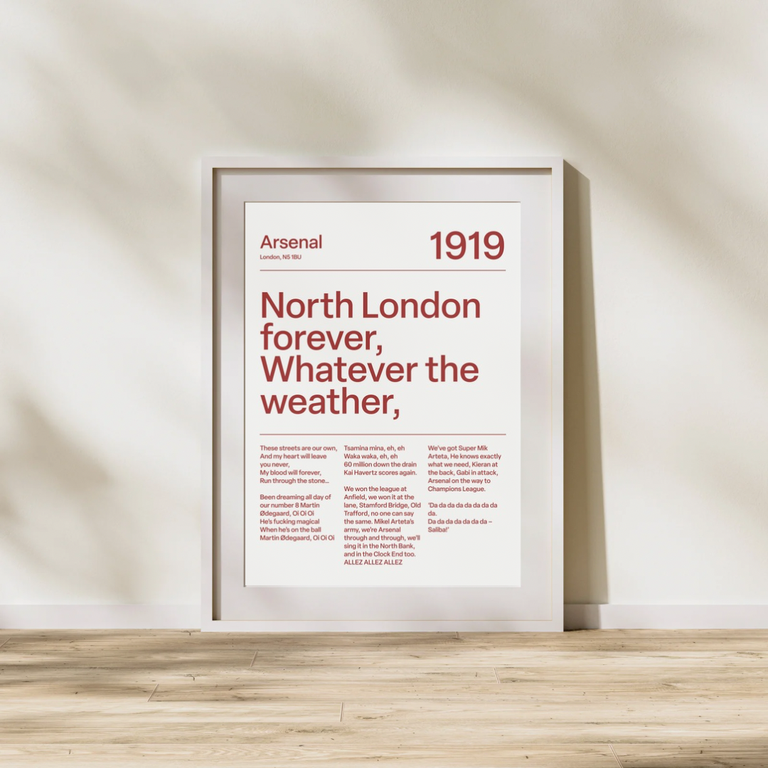 Sounds of the stands, meets modern design. This Arsenal typography print brings iconic fan chants to life . A sharp, understated piece for any Gooner’s collection. This is our white variant.